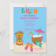 Start your celebration off right with this adorable Luau invitation. Whether it's a backyard barbecue or a kids birthday party this is the perfect invite for you! It has a a light blue background. Across the top of the invitation is the word "Luau" with an orange hibiscus flower in the centre of the word. There's a large colourful tiki head with a coconut shell drink sitting int he sand. There'a also hot pink flip flops in the sand on the bottom. Check out the many other designs and products in this line. ©JW Illustrations