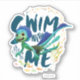 Sea monster Luca swimming with a school of fish, featuring the words "Swim With Me".