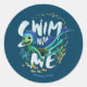Sea monster Luca swimming with a school of fish, featuring the words "Swim With Me".
