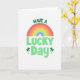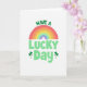 This card features a simple white background with a centered layout that feels friendly and upbeat 💚. At the top, “HAVE A” appears in a darker emerald green and curves gently, like it’s leaning in toward what comes next. Tucked right beneath that arc is a rainbow 🌈, stretching from red and orange through yellow, green, blue, and purple, like a bright bridge connecting the words above and below. Under the rainbow, “LUCKY DAY” sits in a lighter spring green, giving the message a softer, more welcoming look. Two small shamrocks in matching bright green sit on either side of “DAY,” like little companions framing the line and adding a quiet, close-knit touch ☘️. The flat shapes and crisp edges keep everything modern and uncluttered, with the greens and rainbow doing all the talking. The text is stacked in the center, with the curved top line, the rainbow band, and the straight “LUCKY DAY” line aligned neatly on the page. The shamrocks are evenly spaced beside “DAY,” and the rainbow’s arc mirrors the curve of “HAVE A” above it.