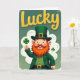 This card shows a smiling leprechaun front and center, with rosy cheeks and a thick orange beard that frames his face like a cozy collar. He’s dressed in deep green from top hat to suit, with shiny gold buttons and a gold buckle catching the light as if someone just brushed them for a night out. His arm reaches forward to offer a four-leaf clover 💚, and the gesture feels friendly and a little flirty, like he’s sharing a secret charm with someone close. A smaller shamrock floats nearby ☘️, tucked among soft white cloud shapes that curl around the scene. Above his head, the word “Lucky” sits near the top in golden lettering, arched like a small banner over his hat. The background is a textured green wash that looks brushed on, giving the whole image a warm, storybook setting. The greens range from dark emerald to lighter leaf tones, while the gold accents pop against the orange beard and the pale clouds. Near the top center, “Lucky” glows in gold above the leprechaun’s hat, with white cloud forms drifting around his raised hand and clover.
