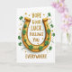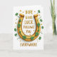 This card features an upward-facing golden horseshoe that gleams like polished metal against a bright white background, with emerald shamrocks curling around its inner curve for a close, affectionate feel 💚. The clovers are shaded with soft shadows, and their stems seem to tuck in and overlap as if they’re gently holding on to the horseshoe. A thin green patterned trim runs along the inside edge, tying the leaves to the gold shape like a neat little ribbon of detail. Centered inside the horseshoe, the message “HOPE GOOD LUCK FOLLOWS YOU EVERYWHERE” appears in textured gold lettering that looks lightly dusted with glitter. The words sit stacked in the middle, filling the open space while leaving a small margin of white around them. Around the horseshoe, small gold stars and tiny glowing dots scatter like confetti, adding a celebratory sparkle ☘️. The final look shows crisp highlights on the horseshoe’s curves, velvety green leaf surfaces, and a few stars drifting near the top-right edge.