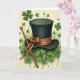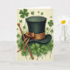 Designed with a deep dark-green top hat at the centre, this St. Patrick’s Day card sets a cozy, old-world scene with a gentle glow on the hat’s velvety surface 💚. A bronze ribbon wraps the base and falls into a soft bow, like a small gift left for someone special. Resting against the hat is a polished wooden walking stick with a golden tip and end cap that catch the light, suggesting a companion strolling close by. Behind them, layers of shamrocks and clovers in several green shades spread across the background, creating the feeling of friends gathered shoulder to shoulder ☘️. The backdrop is a creamy, parchment-like tone that makes the greens and warm browns stand out without looking harsh. Near the top, a short St. Patrick’s Day greeting appears in light green lettering, centred above the hat for easy reading. The clovers vary in size and shape, with subtle shading along each leaf and a few tucked partly behind the hat and cane.