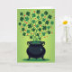 This design shows a dark, rounded cauldron sitting at the bottom center, its inky surface making the contents feel mysterious and inviting. From the opening, a fountain of four-leaf clovers bursts upward ☘️, their thin stems curving and crossing as they fill most of the card. The clovers shift through several greens, from deep emerald to softer spring tones, and their shapes stay crisp against a lime-green background that fades gently from lighter to slightly deeper color. Tucked among the leaves are small red hearts that float upward like they’re caught in the same lift, adding a quiet, affectionate spark 💚. The way the hearts weave between the clovers reads like a friendly flirtation, as if luck and love are chasing each other through the air. Near the top, the greeting text sits centered in a medium green, spaced so it doesn’t crowd the clover stems. The overall scene stays bright and airy, with the cauldron grounded below and the clovers and hearts rising into the upper corners.