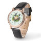 Watch with a St. Patrick's Day themed image.  A black and gold horseshoe sitting in a bed of green clover with shiny gold coins.