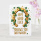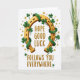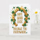 This card features a polished golden horseshoe at the center, curved slightly forward so it catches the light like warm metal. Deep emerald ribbons wrap around the arc, and their darker stripes add a gentle texture that feels like a friendly embrace. Small three-leaf clovers in fresh green tuck along the horseshoe and ribbon edges, as if they’ve drifted in close together for luck and company ☘️. A scatter of golden stars, from tiny specks to larger bursts, spreads outward and adds a twinkling glow against the white background 💚. Inside the horseshoe, the words “GOOD LUCK” sit in the middle in a golden-brown, sans-serif style, balanced and easy to read. Below, “FOLLOWS YOU EVERYWHERE” curves along the lower arc in the same golden-brown color, echoing the horseshoe’s shape. The white space stays open and bright, making the gold and greens stand out while the clovers and stars appear to float around the central charm. Several stars radiate just beyond the horseshoe’s edges, with clovers clustered near the sides of the ribbon.
