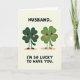 This card shows two anthropomorphic four-leaf clovers standing close together on a soft, creamy background, their bodies angled inward like they’re sharing a private joke 💚. The left clover is a deeper emerald green, while the right one is a lighter lime green, giving them a gentle contrast that’s easy on the eyes. Each has wide, bright eyes, a big smile, and small orange blush circles on their cheeks that make their connection feel tender and a little bashful ☘️. Their thin, stick-like arms and legs keep the look simple, and their feet rest above faint oval shadows that lightly anchor them to the page. At the top, “HUSBAND..” appears in black, all caps, centered and spaced to stand out against the pale background. At the bottom, “I’M SO LUCKY TO HAVE YOU.” is also in black, all caps, centered, and set in a larger, easy-to-read style that balances the top line. The two clovers’ warm expressions and matching blush make them read like a devoted pair, framed by lots of open space around them. The scene stays uncluttered, with the only extra details being the soft shadows beneath their feet and the crisp black lettering above and below.
