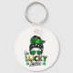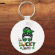 This is a fun key chain to celebrate St. Patrick's Day with a design featuring a woman with her hair in a bun wearing sunglasses and the words "One Lucky Lassie".