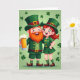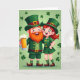 This card shows a stout, red-bearded leprechaun-like fellow in an emerald suit and tall green hat with a gold buckle, lifting a foamy pint of amber ale as if to toast you 💚. Tucked close under his arm is a red-haired companion in a matching green hat, her hair spilling down as she leans in with an easy, friendly closeness. She wears a green dress with shiny gold buttons, striped green socks, and curled-toe shoes that add a storybook touch. Their wide smiles and bright eyes meet at a slight angle, like they’re sharing a private joke in the middle of the celebration ☘️. Behind them, a soft green gradient sets a gentle stage, making their reds and greens stand out without looking harsh. Small shamrocks drift around the pair, filling the open space and framing their faces. Any greeting text sits near the top in light gold lettering, leaving the characters to dominate the center. The gold buckles, the froth on the drink, and the scattered shamrocks are the sharpest details against the smooth green background.