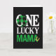 This greeting card features stacked, centered text reading “ONE LUCKY MAMA” on a deep black background, with the words arranged in neat tiers that guide your eye from top to bottom. The “O” in “ONE” is replaced by a three-leaf shamrock, its heart-shaped leaves filled with a green-and-black buffalo check that adds a cozy, down-to-earth touch ☘️. “ONE LUCKY” appears in crisp white lettering, while “MAMA” sits just below in a rich emerald green that feels like a warm nod to St. Patrick’s Day 💚. A small golden horseshoe rests near “MAMA,” angled upward like a little charm tucked close for someone you care about. With no characters on the scene, the affectionate tone comes through in the way the lucky symbols lean in toward the word “MAMA,” like a gentle hug made from icons and type. The layout stays tightly centered, keeping the message front and forward, with the shamrock acting as the focal point at the top. The black backdrop leaves plenty of breathing room around the white and green text, making the shapes and colors stand out sharply. The final visual detail is the tiny gold horseshoe sitting beside the green “MAMA,” glowing softly against the dark background.