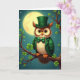 This card shows a well-dressed, humanlike owl perched on a sturdy branch beneath a moonlit, deep-teal sky, with a few ☘️ shapes glowing around it. The owl wears an emerald green top hat, a matching bow tie, and a fitted jacket, like it’s dressed up for St. Patrick’s Day. Its large golden-amber eyes catch the light and seem to linger on you with a gentle, friendly attention, like a quiet invitation to stay close. Cream feathers on its chest fade into rich brown around its face, and its orange talons grip the branch with steady confidence. Glowing four-leaf shamrocks thread along the branch’s curves, adding little points of green light that feel like shared secrets in the dark. A greeting sits near the top in light green lettering, standing out against the night sky, with a smaller line of text placed near the bottom in a softer mint tone 💚. Behind everything, a full moon shines with a pale halo while tiny stars scatter across the background and a small nest rests just below the owl on the branch.