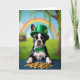 This card features a Boston Terrier puppy with an earnest, affectionate gaze, dressed in an emerald-green top hat with a shamrock and a matching bow tie 💚. Its black-and-white coat stands out against the festive greens, and the little dog’s posture feels like it’s leaning in close, as if sharing a private moment with whoever’s holding the card. The puppy’s paws rest on a scatter of shiny gold coins, and the red-painted nails add a cheeky, flirty touch to the scene. In the background, a soft-focus green landscape stretches under a calm blue sky, setting a gentle, romantic mood without needing any extra fuss. A rainbow curves across the distance 🌈, guiding the eye through the scene like a path toward a lucky find. The St. Patrick’s Day greeting appears near the top in green lettering, standing out clearly against the lighter sky area. Off to the left, a dark pot sits slightly blurred near the edge of the landscape, with the rainbow arching above it.