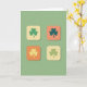 This card features four stylized shamrocks arranged in a neat 2x2 grid on a muted sage green background, with each clover sitting inside a rounded square tile. The tiles alternate between creamy beige and warm peach, and a soft shadow under each one gives a slight lift, like they’re gently floating side by side. The shamrocks themselves shift from fresh spring green to deeper teal, with one in a soft sunny yellow, creating a calm mix of cool and warm tones 💚. The careful spacing and matching shapes make the design feel like a quiet shared moment, as if the clovers are paired up in friendly conversation ☘️. Any greeting text would sit best centered beneath the grid in a light cream or pale peach, keeping the layout balanced and easy to read. If a shorter line is added, it could also appear in small type at the top, aligned to the middle in a darker teal to echo the leaves. Each rounded square has smooth corners and a gentle, diffused shadow that stays close to the edges.