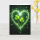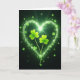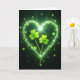 This design shows two shamrocks rising from the bottom, their slender stems gently intertwined like close friends leaning in, with each three-lobed leaf shaded from light lime edges to deeper emerald near the base 💚. A glowing heart outline surrounds them, built from swirling green particles and tiny sparks that curl inward as if holding the pair together. At the top point of the heart, a star-like burst sends sharp emerald rays outward across a dark, inky background, spotlighting the leaves and their fine veins. Smaller shamrock silhouettes drift around the scene, adding depth and a quiet sense of company ☘️. The greeting “Happy St. Patrick’s Day” sits near the top in bright green lettering, centered just beneath the burst of light. A shorter line of text rests near the bottom in pale green, tucked above the stems so it doesn’t cover the intertwined detail. The background is scattered with faint twinkles and soft green specks, with the heart-shaped glow brightest along its upper curve.