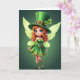 This card features a leprechaun-fairy sprite centered on a deep emerald background, bringing a friendly St. Patrick’s Day mood to the scene 💚. She stands in a light step with arms gently open, like she’s greeting a close friend with an easy, affectionate welcome. A tall green top hat with a gold buckle and two shamrocks sits above curled auburn hair that spills down in soft ringlets. Her bright blue eyes and rosy cheeks pair with a small, knowing smile that feels like a shared secret ☘️. She wears a strapless green dress with gold lacing and trim, flowing into a ruffled skirt that adds movement around her knees. Mid-calf green boots detailed with gold scrollwork and slim sleeves finish the outfit, while translucent lime-green wings spread behind her with a faint glow. The greeting text sits near the top in light gold lettering against the dark green field, and the wings fade outward in pale lime tones behind her shoulders.