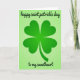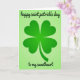 This card shows a large four-leaf clover in rich emerald green at the center, with gentle shading that gives it a little depth. Each rounded leaf resembles a soft heart shape, and they meet closely in the middle like a couple leaning in, with a slim stem extending downward. The background is a pale lime green with a light, grainy texture that feels like fabric or fine paper. Above the clover, the phrase “happy saint patrick’s day” sits near the top in flowing black lettering, and below it, “to my sweetheart” appears in the same black style near the bottom. The dark text against the light green backdrop keeps everything easy to read while letting the clover stay the main focus. The mix of greens feels fresh and springlike, and the sweetheart line adds a gentle, affectionate tone 💚. A small ☘️ detail is echoed in the clover’s heart-like leaves and the softly speckled lime background.