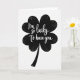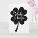 This card features a centered four-leaf clover in deep, textured black on a wide white background, with four rounded leaves that meet in a soft, heart-like shape. Across the clover, the message “I’m so lucky To have you” appears in luminous white lettering that curves gently with the form. The words sit right inside the dark shape, so it feels like a private note tucked close, like two friends leaning in or a couple sharing a quiet glance 💚. A slightly curved stem drops down from the clover, giving the simple layout a natural, grounded look. Instead of a flat fill, the black areas show an uneven, brushy texture, like charcoal softly rubbed across paper. The strong black-and-white contrast keeps everything focused on the clover and the message, with no extra scenery competing for attention ☘️. The clover’s edges stay crisp against the white space, and the textured black surface shows subtle streaks and grain throughout.