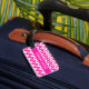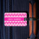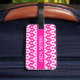 A pretty double-sided, acrylic luggage tag with a pattern of decorative chevron shapes in candy pink and white. The strap is in leather.