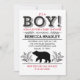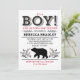 Celebrate in style with this lumberjack baby shower invitation. It features bold lettering, a bear among foliage with a buffalo plaid pattern on the back. It makes an adorable theme for your baby boy shower.