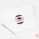 A circular lumberjack style return address label. It features a woodland bear and forest foliage.