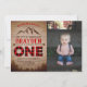 A lumberjack themed first birthday invitation with a warm wood background and a whimsical mountain silhouette. The word 'One' is done in a colourful buffalo plaid and adds a fun pop of colour. Ask about second, third, fourth, etc... birthdays. Add a photo to personalize.