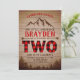 A lumberjack themed second birthday invitation with a warm wood background and a whimsical mountain silhouette. The word 'Two' is done in a colourful buffalo plaid and adds a fun pop of colour. We can customize this to any age, just ask :)
