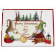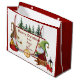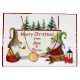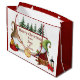 This fun Holiday gift bag has two funny little gnomes sawing a log with a message sign that wishes the receiver a Merry Christmas, with your own custom signature. Behind the sign are snow covered pine trees, and everything is placed on a sky blue background. The other side has the same image and text, and the sides of the bag are matching red.