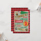 TIMBER! Super cool Lumberjack Birthday party invitation with red flannel background. Features log fonts, axe, wildlife, stumps, tree, beard and moustache, corncob pipe, wood signs and a mountain range of faded light green faux paper. Great for the kid that loves the outdoors...girl or boy! Hand drawn illustrated by McBooboos