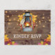 Cartes de réponse de mariage rustiques avec un fond de grange en bois, des feuilles d'automne, une lanterne allumée, des guirlandes lumineuses et un modèle de RSVP moderne.