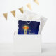 Happy Diwali illustration: A shiny Diwali lamp with red diyas (cup-shaped indian oil lamps) with an ornamental border on a night sky background and the greeting written in Sanskrit.