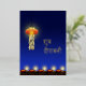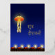 Happy Diwali illustration: A shiny Diwali lamp with red diyas (cup-shaped indian oil lamps) with an ornamental border on a night sky background and the greeting written in Sanskrit.