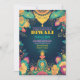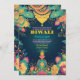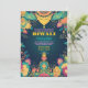 The front of the invitation features a rich dark background that beautifully contrasts with vibrant yellows and turquoise, creating a striking and festive atmosphere. At the bottom, a single ornately detailed Diya lamp shines brightly, serving as the focal point of the design. The vibrant yellows and turquoise are complemented by delicate pink elements, adding a touch of elegance and playfulness. Hindu ornamental patterns weave through the design, enhancing the traditional charm and adding depth. The event details are displayed in a sophisticated script that harmonizes with the rich colours. The back of the card continues the dark theme, providing space for customizable text and Diwali wishes, framed by the same vibrant hues and intricate patterns. This design offers a perfect blend of tradition and vibrant celebration