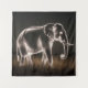 Luminous Elephant Silhouette, a photograph of a silhouette of a luminous elephant. The elephant's body is illuminated, with the light highlighting the majestic height of its trunk and the arch of its back. The elephant is standing in a field of tall grasses, which are also illuminated. The background is a solid black. The lighting creates a sense of grandeur.
