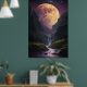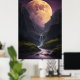 This enchanting poster captures a breathtaking moment under the night sky, where a magnificent golden moon takes centre stage, casting its luminous glow over a serene mountain landscape. The moon, impossibly large and radiating a soft, golden light, seems to hold secrets of the universe in its glow, illuminating the scene with a mystical aura. Below, a gentle stream meanders through the rugged mountain terrain, reflecting the moon's ethereal light and enhancing the magical atmosphere of the scene. The sky, painted in deep shades of purple, adds a layer of mystique and wonder, creating a harmonious balance between the celestial and the earthly. This poster is not just a piece of art; it's a doorway to a tranquil, otherworldly place where nature's beauty is in perfect sync with the cosmos.