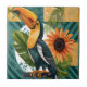 The picture shows a magnificent tukan with a bright orange beak that is proud to be sitting on a branch. Surrounded by lush green leaves and a bright sunflower, it radiates a peaceful, exotic warmth. The vibrant colors and the patchwork-like design give a sense of naturalness and serenity.