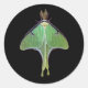 This sticker features the incredible luna moth, a lime-green, Nearctic Saturniid moth in the subfamily Saturniinae. With a wingspan of up to four and a half inches, this lovely creature ranks as one of the largest moths in North America. This adult moth has just emerged from the cocoon and is waiting on the bark of a tree trunk to dry and harden. The adults do not eat or have mouths. They live for only one week and emerge as adults only to mate. With lime green colour and distinctive eyespots this is a very mysterious, magical looking being.