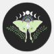 A vibrant green luna moth is surrounded by moon phases and lush green leaves against a deep black background.