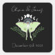A vibrant green luna moth is surrounded by moon phases and lush green leaves against a deep black background.
