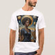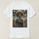 Command the cosmos in this Lunar Crown Galactic Empress Shirt. A majestic woman stands draped in a sleek black gown, crowned by a glowing golden moon that radiates behind her natural hair like a celestial halo. Surrounded by swirling planets, mountain peaks, and river valleys, she exudes divine feminine energy and cosmic sovereignty. Her regal presence is enhanced by ornate earrings and a radiant gold necklace with a powerful gemstone centerpiece.