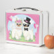 Charmante image d'un dessin animé, un couple de lamas dans leurs tenues mariages sur un arrière - plan rose et le coeur tout autour d'eux. Cela fait une bonne boîte à lunch pour un enfant qui aime les lamas ou un adulte qui fait un déjeuner. Il fait également une grande douche nuptiale ou un cadeau mariage.