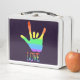 Jolie main arc-en-ciel dans la langue des signes mot pour l'amour, est au-dessus du mot LOVE qui est écrit en couleurs arc-en-ciel, sur des boîtes à lunch personnalisées. La couleur arrière - plan du violet foncé peut être customisée à n'importe quelle couleur de votre choix. Merci pour faire du shopping à CherylsArt sur Zazzle.