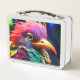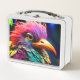 Cette boîte à lunch est ornée d'un oiseau d'art.