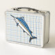 Not many fish are more incredibly beautiful than the blue marlin -- and not many fish are larger. The blue marlin is the largest of the Atlantic marlins and, seriously, one of the biggest fish in the world. As with some species, the female is often quite a bit larger than the male. Females can grow up to 14 feet long and can weigh more than 1,900 pounds, though the average runs more around 11 feet long and 300-ish pounds. A deep blue on top and silvery-white beneath, with a pronounced dorsal fin and a long, lethal, spear-shaped upper jaw (that some refer to as a bill), blue marlins are one of the most easily identifiable and recognizable fish in the world. Marlins are renown for their incredible stamina in a fight when they are hooked, which makes them a trophied favourite of big game fishermen. Though it can also be said of virtually any super big fish, I can't imagine there's much more thrilling to the avid angler than hooking one of these giants and seeing it break water in the fight. This design pays homage more to this majestic fish than the anglers that seek it. For this wonderful lunchbox, a single blue marlin (on either side) leaps on a sea of colour-coordinated plaid. This marvellous lunchbox is an excellent choice for Father's Day, father's birthday or any day you are celebrating your favourite angler or future angler.