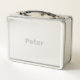 Cette Boîte à lunch inoxydable est de couleur gris. Le nom Peter est sur la boîte à lunch à l'avant et à l'arrière. Le nom est en texte argenté. Vous pouvez modifier le nom à l'aide du bouton Personnaliser.