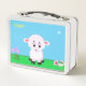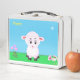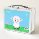 Caricature de brebis joyeux, fleurs & star Lunch Box. Un texte heureux peut être personnalisé.