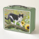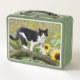 Un chat mignon, tuxedo motif bicolor noir et blanc, European Shorthair, marchant sur une branche d'arbre dans un jardin avec des tournesols fleuris. Les chats ont un sens de l'équilibre exceptionnel et ils obtiennent un équilibre gracieux. Photo Katho Menden. Cette boîte à lunch est une idée cadeau pour les amoureux de les chats.
