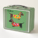 Cute lunch box with Dachshund puppies pictured, and a name that can easily be changed. Thanks to Creative Fabrica for some of the elements in the design. The lunchbox is green, one dog is brown, the other one black and they are both wearing dotted clothing.