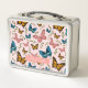 La boîte à lunch de la fille à la lunette avec l'illustration de papillons bleus, jaunes et roses au feuillage vert transformé en motif. Vous pouvez ajouter un nom en bas.