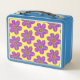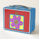 Police Monogramme en vert contre arrière - plan rouge foncé. Fleur violet brillant avec vert sur les pétales et bleu clair, jaune, blanc, rouge accents contre l'arrière - plan jaune souligné dans le bleu ciel carré géométrique. L'arrière a un arrière - plan jaune avec des fleurs violettes motif. Conception originale © TamiraZDesigns.