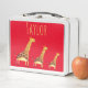 Super boîte à lunch pour l'école, ce design est composé d'un arrière - plan rouge avec des girafes aquarelles. Personnalisez avec un nom.